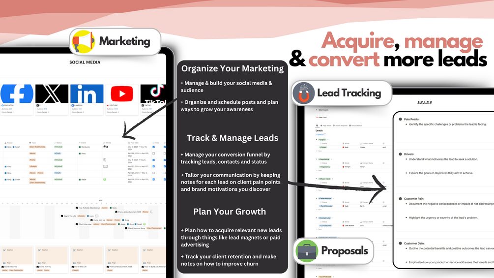 🧲 Lead Manager: Nurture your lead pipeline and track progress toward conversion. Tailor communication to meet client needs and drive conversions.