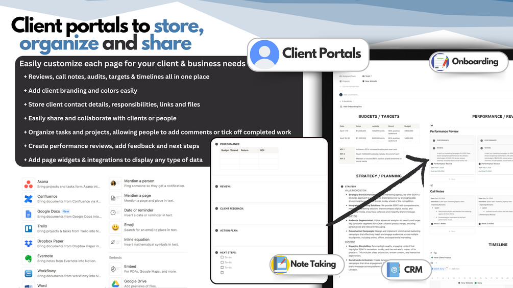 📁 Client Pages: Create detailed client pages to store essential information such as KPIs, tasks, goals, and performance reviews. Keep track of all client-related data, stakeholders & relationships to deliver exceptional service.