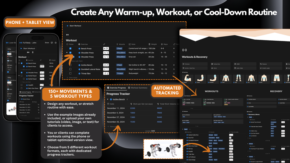 - 🤝 Client Collaboration: Share pages with clients so they can log their progress, complete workouts, and view notes and feedback.