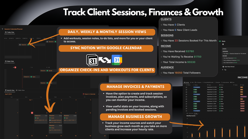 Simplify scheduling with our integrated calendar system. Effortlessly organize client sessions or meetings, sync with Google Calendar or the Notion Calendar app, and keep detailed notes. Clients can easily access today’s session details and gain a clear view of the week ahead, ensuring everyone stays on track and informed.