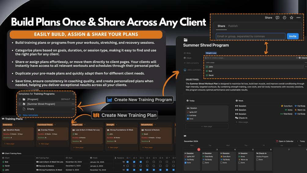 - 🤝 Client Collaboration: Share pages with clients so they can log their progress, complete workouts, and view notes and feedback.
